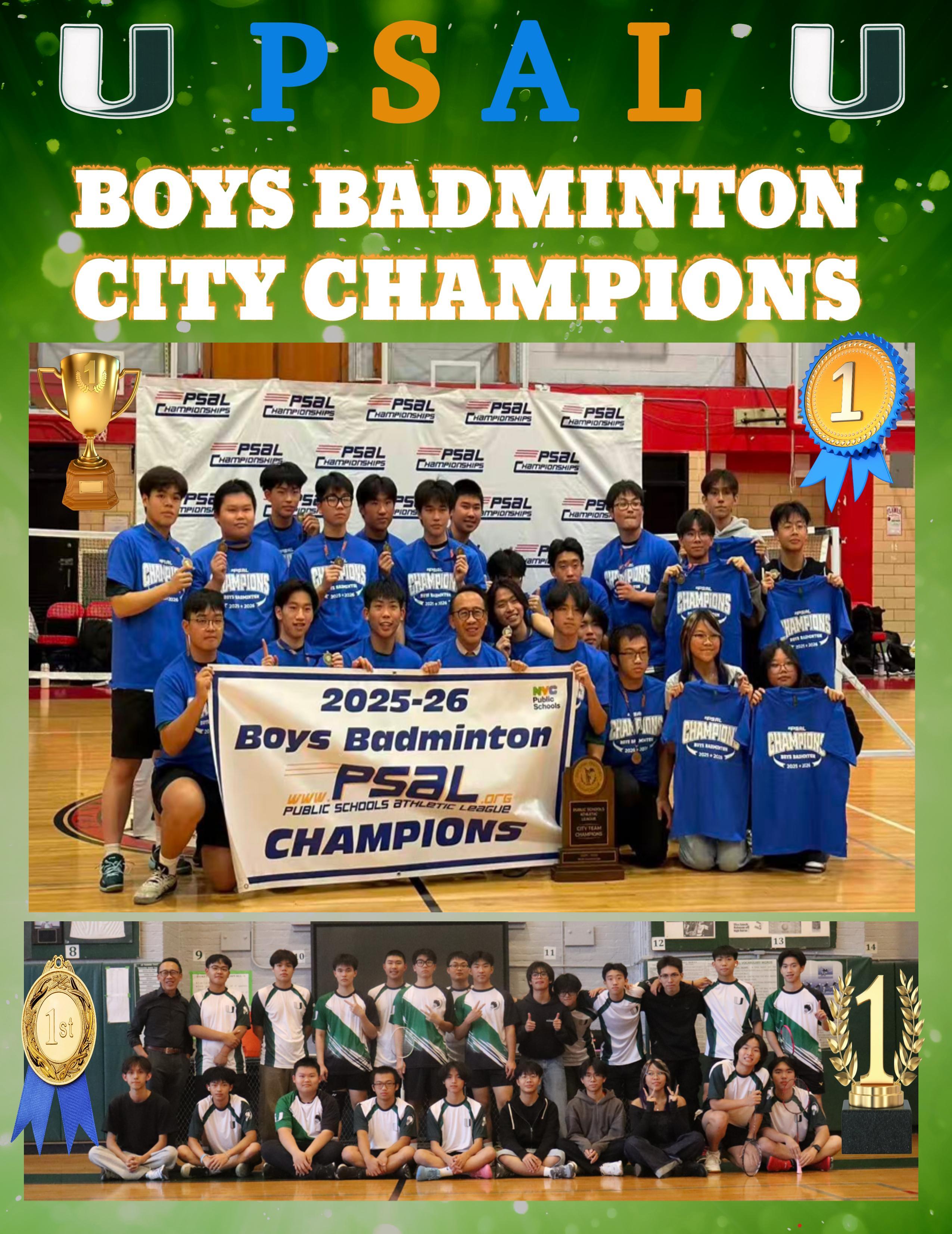 Huge congratulations to our PSAL City Champion Boys Badminton Team, coached by Mr. Wai! The team had an incredible run—defeating the #2 seed Flushing Campus on Wednesday and the #1 seed Seward Park HS on Friday to secure the city championship.