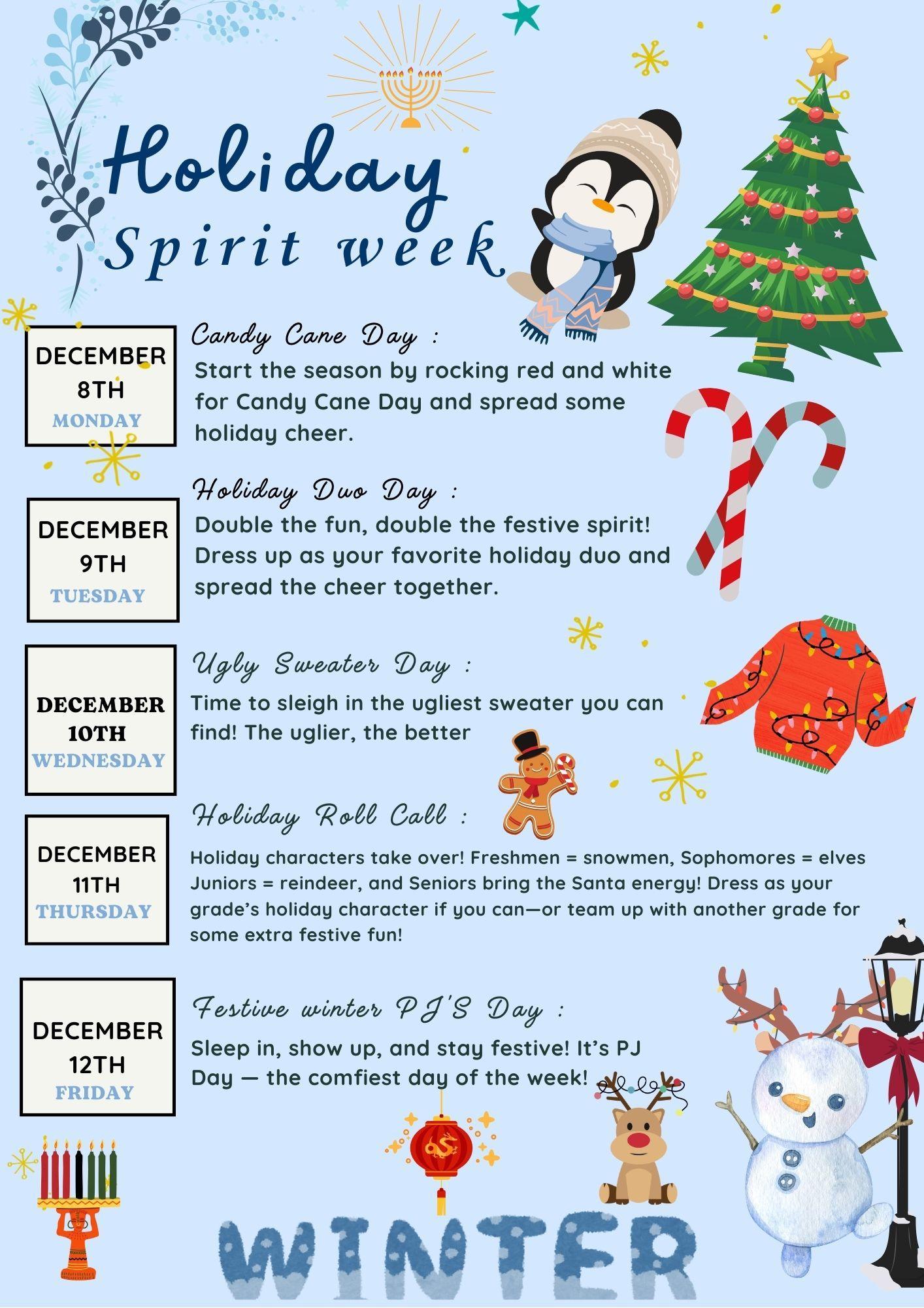 NUHS will be holding its Annual Holiday Spirit Week from December 8th - December 12th.